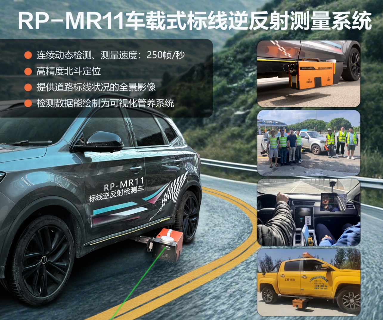 車載式標線逆反射測量系統主要由:主機(光學測量系統、北斗/GPS定位天線)、計算機處理系統、人機交互系統(HMI)等部分組成,能實現在不封路條件下、正常行駛速度下對所有路面標線的逆反射亮度系數進行檢測,具有檢測效率高、檢測樣本覆蓋全、檢測環境安全等優點,并能提供道路標線狀況的全景影像,檢測數據能繪制標線養護地圖、解決了傳統標線逆反射測試儀占用人力、效率低、且抽樣檢測樣本覆蓋不足、檢測環境不安全等問題,是標線施工單位、檢測單位、養護單位控制標線質量的首選設備。